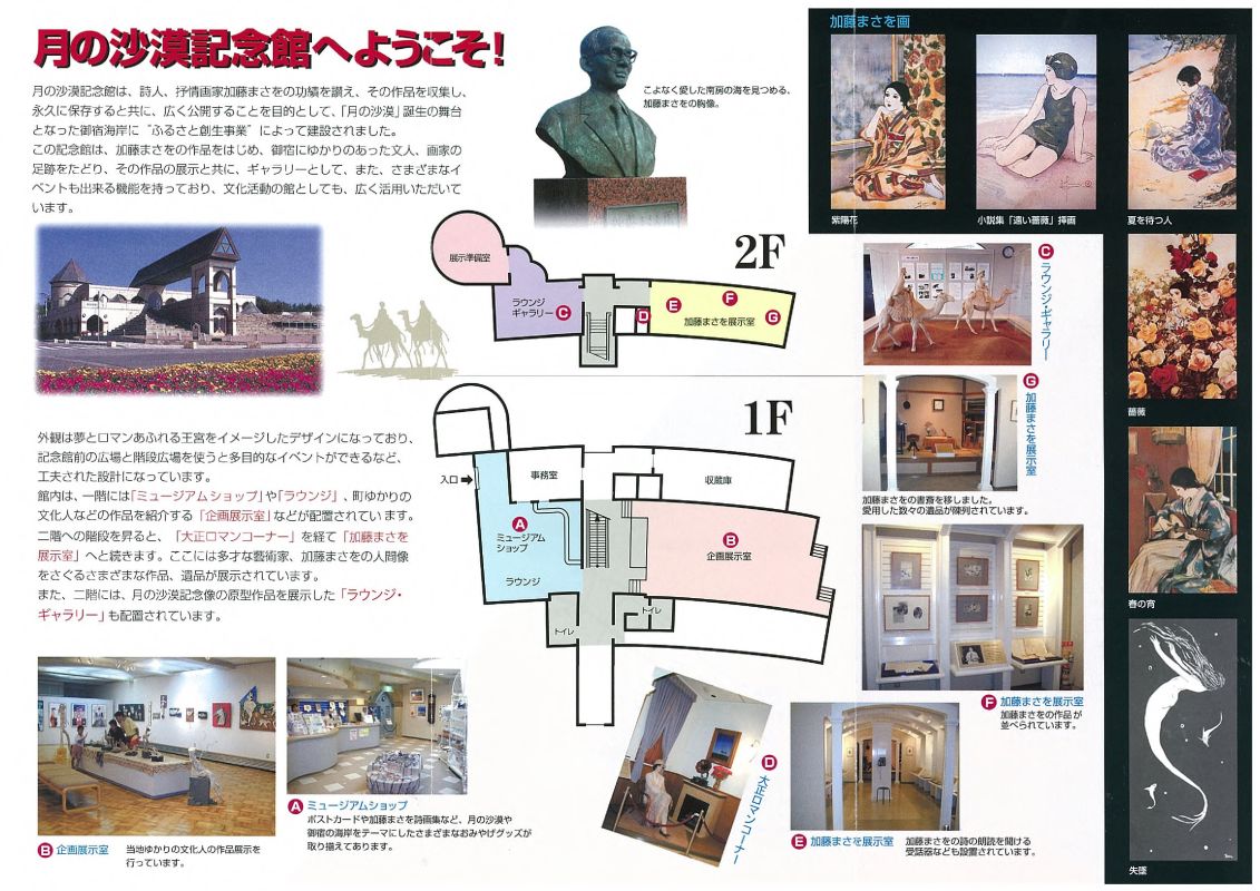 ・月の沙漠の作詞者であり、御宿をこよなく愛した詩人「加藤まさを」の作品や資料、御宿にゆかりのある文人や画家たちの作品の紹介など、伝統ある御宿の再発見と、新たな文化の創造を目指して建てられた記念館です。
