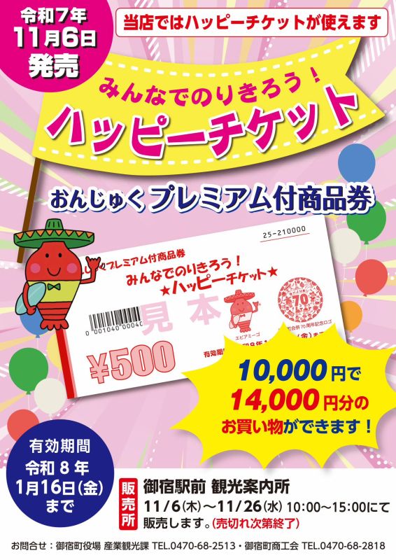 御宿町プレミアム付商品券 「みんなでのりきろう!ハッピーチケット」販売のお知らせ
