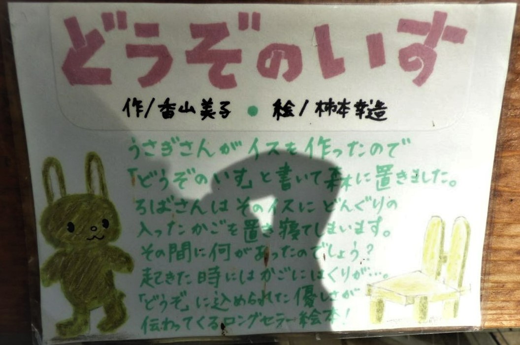 ▲玄関前には絵本「どうぞのいす」と同じく、「交換するスペース」が設置されていました